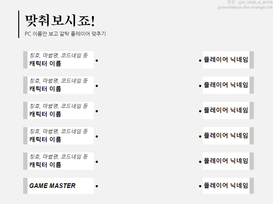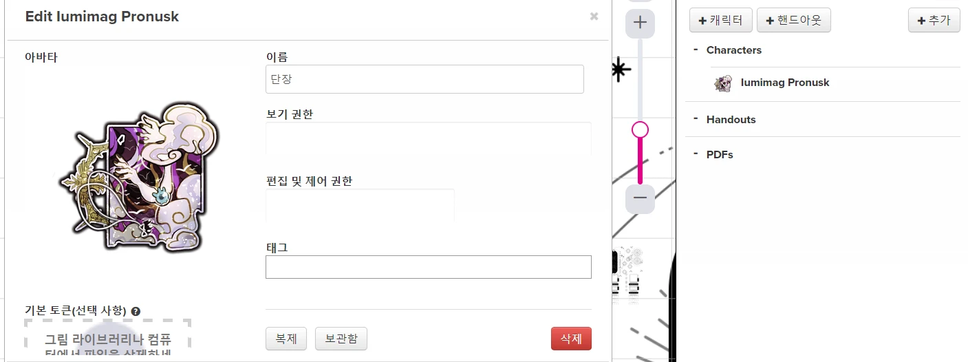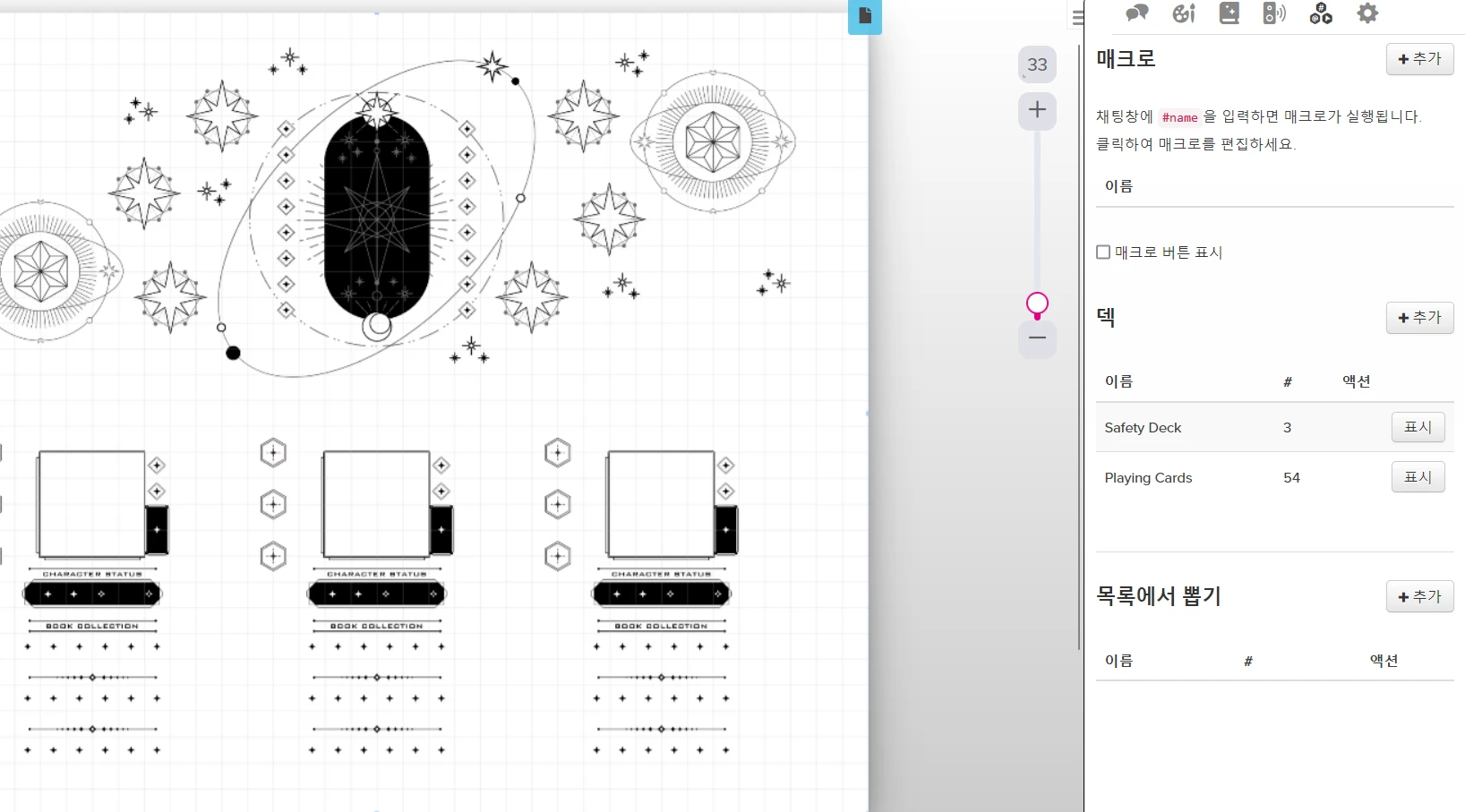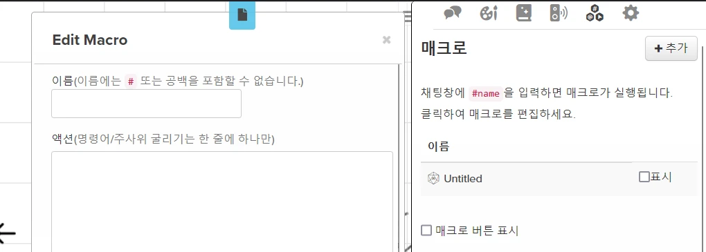 - GM ๋ง๊ณ ํ๋ ์ด์ด๋ ๋งคํฌ๋ก ๊ธฐ๋ฅ์ ์ถ๊ฐํ ์ ์์ต๋๋ค. ์ด ๊ฒฝ์ฐ ํด๋น ๋งคํฌ๋ก๋ GM์๊ฒ๋ ๋ค๋ฅธ PL์๊ฒ๋ ๋ณด์ด์ง ์์์ ์ฃผ์ํด์ฃผ์ธ์.