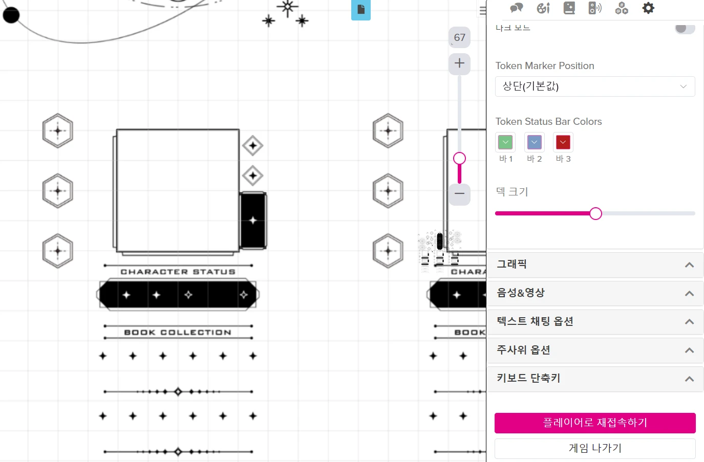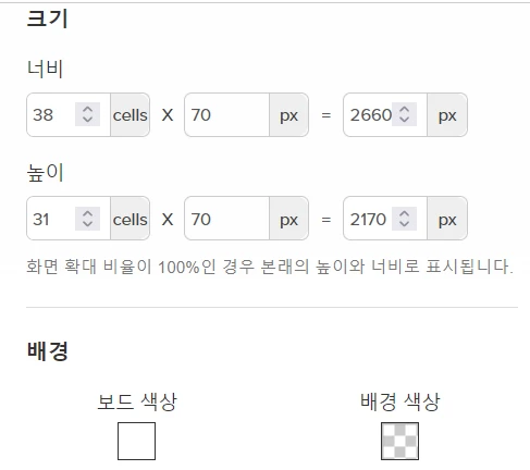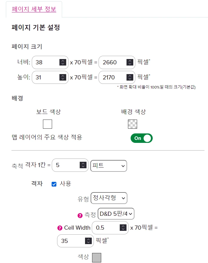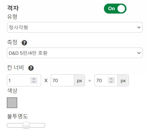 ๋๋ค. 70*70 ๋ฐ์ค๋ Roll20์์ ๊ธฐ๋ณธ ํ ์นธ์ ํฌ๊ธฐ๋ฅผ ์๋ฏธํฉ๋๋ค. ์ฆ ๊ฐ๋ก์ธ๋ก 70์ ๋ฑ ๋ง์๋จ์ด์ง๊ฒ ์ธํ