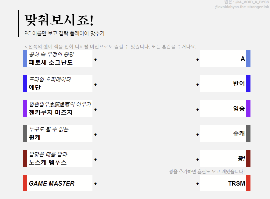 ํ๋ ์ด์ด์ ํธ์๋ฅผ ์ํ ํ๋กฏ์๋ฃ, ์ฐจ๋ก์๋ฃ ์ด๋ฏธ์ง์ ๋๋ค. [๋์ถฉ์ด๋ฐ์์](์ด๋ฏธ์ง ๋งํฌ) ๋ก ๋กค๋ฐฉ์ ๋ถ์ฌ๋ฃ์ผ๋ฉด ์ฌ์ฉํ ์ ์์ต๋๋ค. ๋งคํฌ๋ก๋ก ์ฌ๋ ค์ ํ๋ ์ด์ด์๊ฒ ๊ถํ์ ์ฃผ์ ๋ ์ข์์.