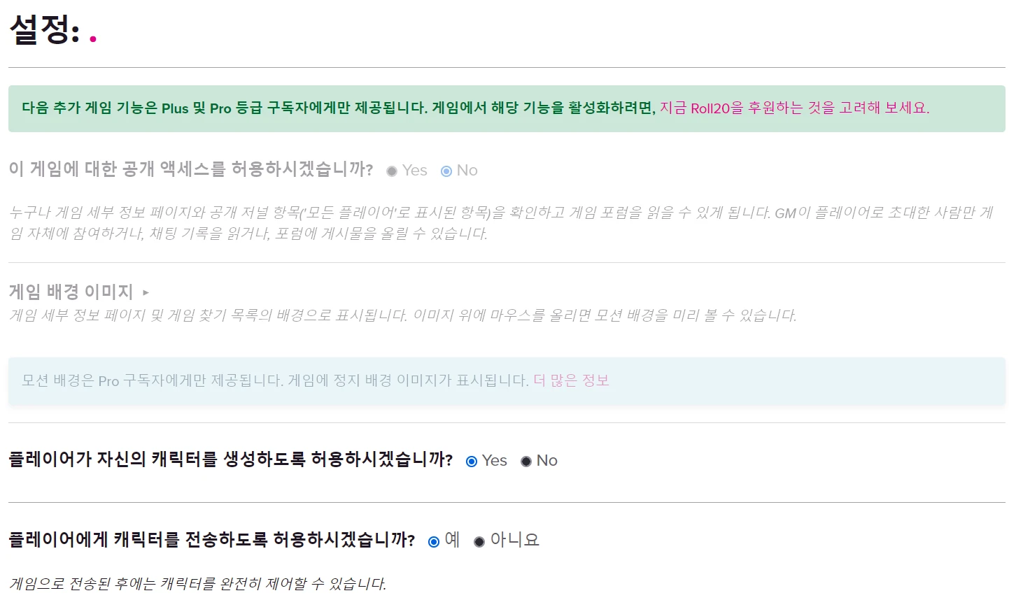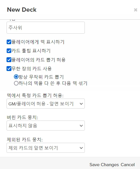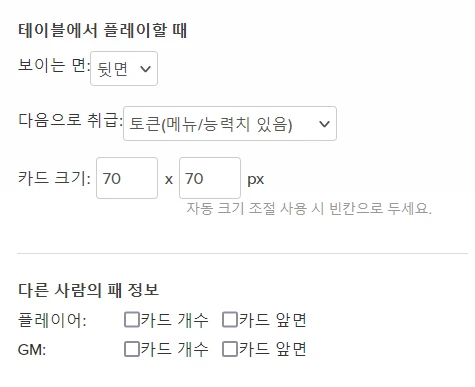 ํ๋จ ํญ๋ชฉ๋ค์ ์ด๋ ๊ฒ ์ค์ ํฉ๋๋ค. (ํ๋ ์ด์ด๊ฐ ํ ํฐ์ ๋๋๋ก ํ๊ณ ์ถ์ผ์ ๊ฒฝ์ฐ, GM/ํ๋ ์ด์ด ํ์ฉ์ผ๋ก ๋ฐ๊ฟ์ฃผ์ธ์.)
