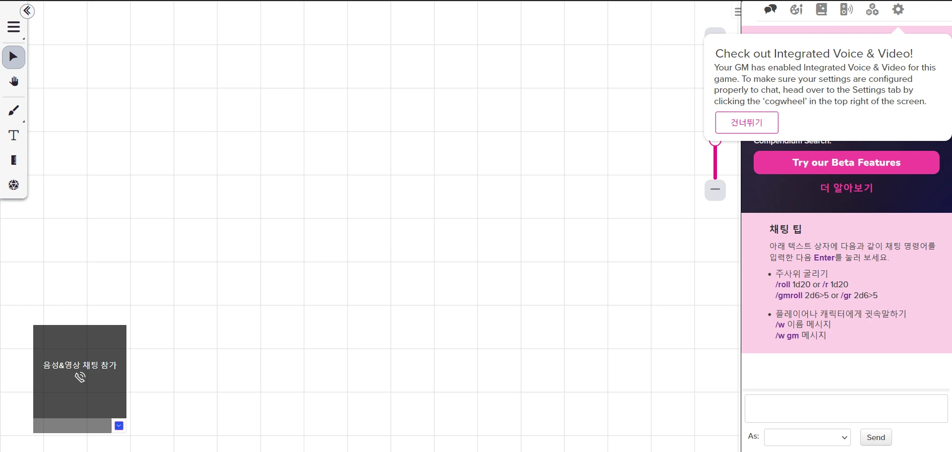 ์ด์ ์ Roll20์ ์ฌ์ฉํด๋ณด์ จ๋ค๋ฉด, ์ผ์ชฝ ํด๋ฐ๊ฐ ์กฐ๊ธ ๋ ๊ธธ์ด์ง ๊ฒ์ ํ์ธํ ์ ์์ต๋๋ค.